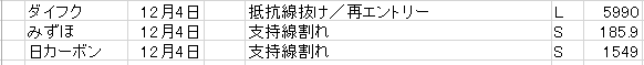 ※日経平均は、ダウ休場もファーフェイ会長逮捕で米中貿易摩擦悪化懸念により全面安。外部環境が悪い。人口動態などのマクロ要因や出口戦略を控えているなどのことから、日経平均だけが上げることはまずあり得ない以上、仕方ない。日経平均の7年連続上昇は絶望的か。