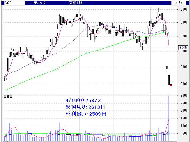 ※これは今日3%利食いまで到達したが、その後LCラインに到達したため、売買ルールの定義に基づくと再エントリーとなる。そして、今日エントリーサインが出た銘柄の中で最も売買代金が多いため代金1位エントリーとなる。あくまで定義に基づいて機械的に選んでいるだけであり、こういうパターンが順行しやすいというわけではありません。