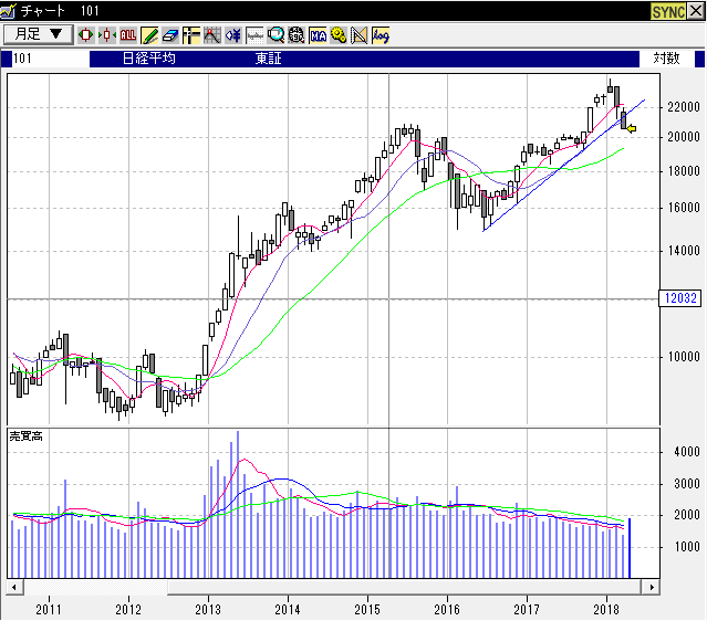 ※日経平均を月足で見ると、2016年6月のボトムから2018年1月のトップまでは9000円上げており、その半値戻しとすると大体19000円になる。
