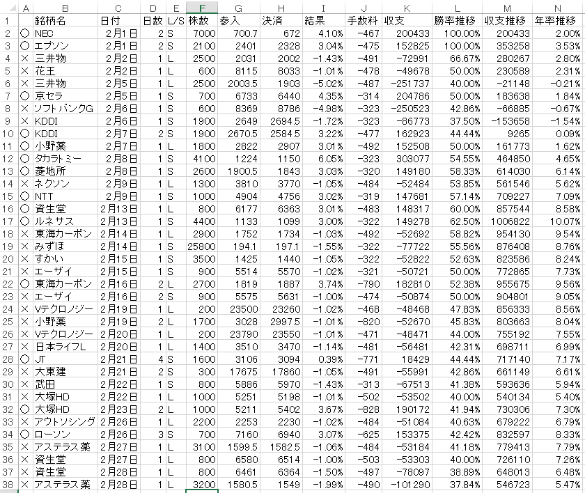 ※2月は非常に示唆に富む内容になったかと思います。どう考えても踏み上げられるとしか思えなかった決算順行の銘柄がそのまま更に下落して利食いとなり、三井物産は-5%超えのLCとなり……。どう考えてもLCになるとしか思えないエントリーも、ルールに従ったら利食いになってしまった。-5%の踏み上げを喰らうも、ルールに淡々と従ったらトータルではプラスになってしまったと。ここで重要なのは、今月はたまたまトータルでプラスになりましたが、「どう考えてもロスカットになるとしか思えん状況でエントリー」したとしても月トータルマイナスになることも当然あります。それでも、ルールに淡々と従うことが重要なんです。更に言うと、事前にどうなるかなど絶対に分からないため、ルールに従うしかないのです。